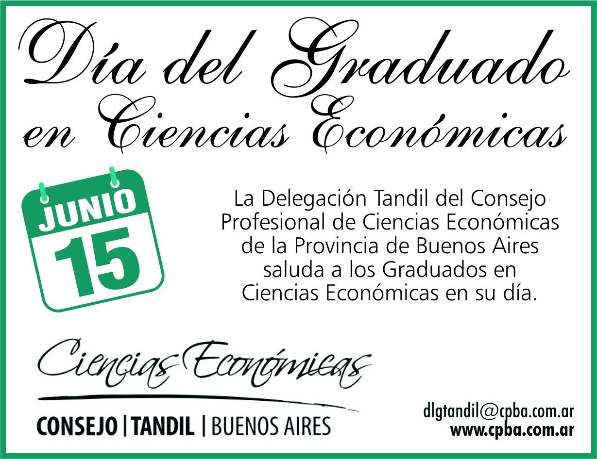 La Delegación Tandil del Consejo Profesional de Ciencias Económicas de la Provincia de Buenos Aires, saluda a todos los Graduados en Ciencias Económicas, fecha que se celebra este miércoles 15 de Junio.