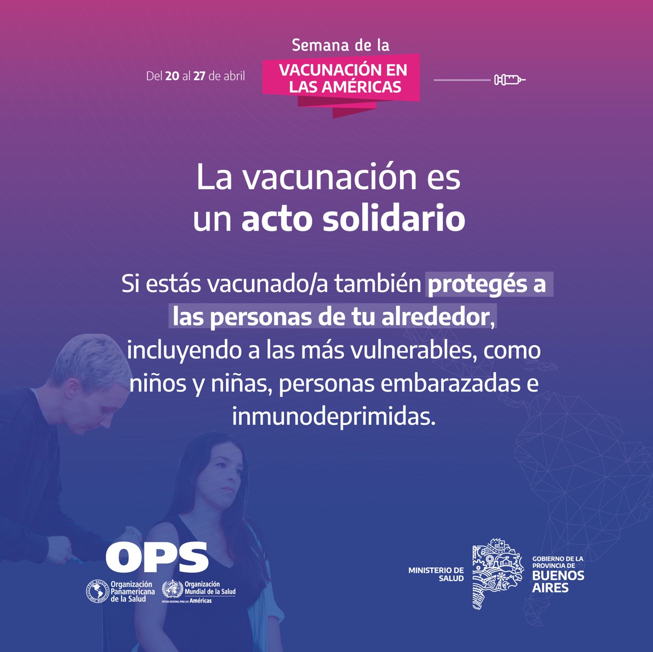 El Ministerio de Salud bonaerense replica la Semana de Vacunación en las Américas promovida por los países miembros de la Organización Panamericana de la Salud. En el ámbito provincial, el foco de la propuesta estará puesto en fomentar la vacunación espontánea con especial atención a las que están en época de aplicación: antigripal y contra el Virus Sincicial Respiratorio (VSR).
