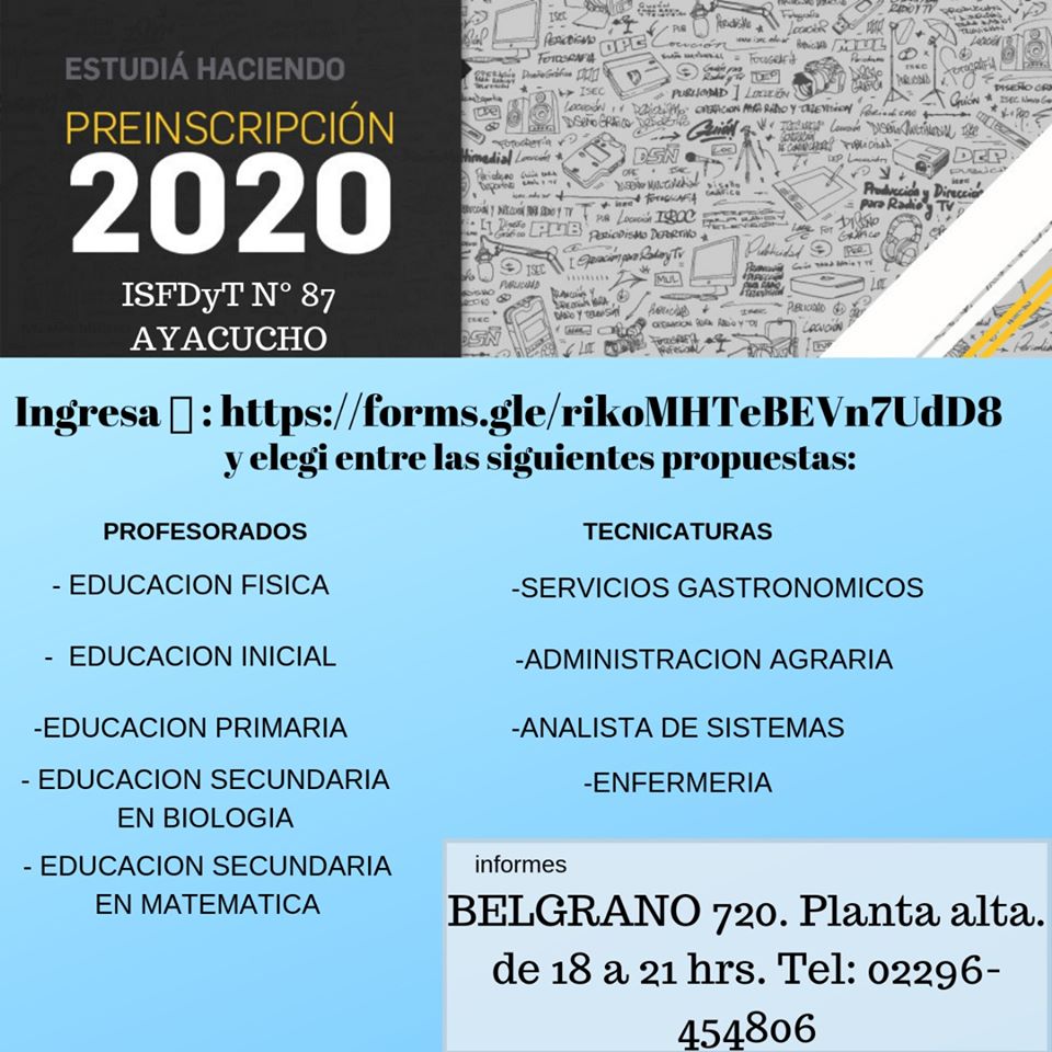 El I.S.F.D y T Nro 87 abrió la Pre-Inscripción 2020 para las carreras del I.S.F.D y T Nro 87. Los interesados deben dirigirse luego de las 18, a sus instalaciones de Belgrano 720 o llamar […]