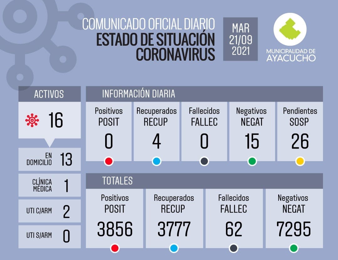Nueva jornada de 0 contagios de Covid en Ayacucho y con 4 pacientes recuperados, logrando con esto que los activos desciendan a 16. De ese total, 3 pacientes se encuentran internados en el Hospital Municipal: […]