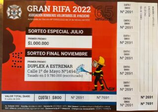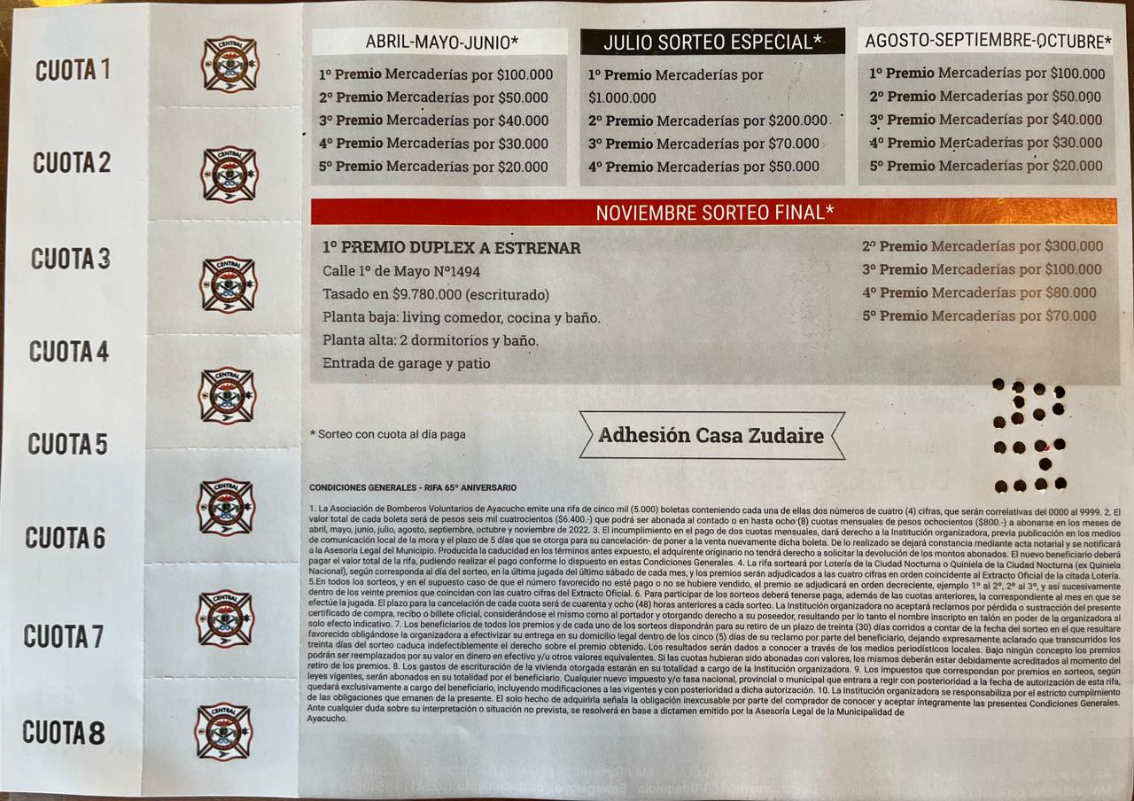 La Asociación de Bomberos Voluntarios tiene en circulación su rifa anual que tendrá como premio final un Dúplex a estrenar construido en calle 1° de Mayo 1494, ya escriturado y con un valor de casi 10 millones de pesos.