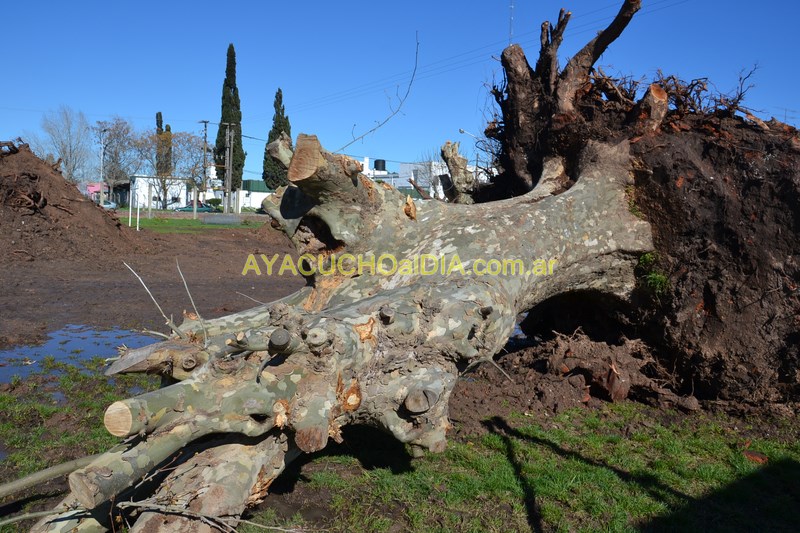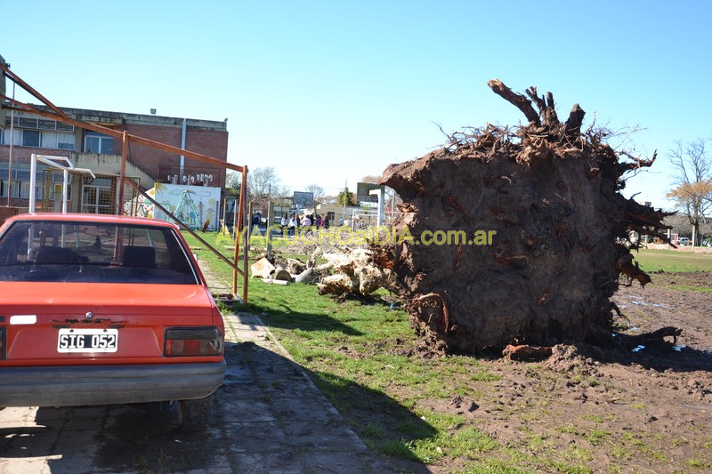 Pasar por el patio de la “Escuela Nacional” llama la atención teniendo en cuenta el trabajo que han realizado para extraer las raíces. “Fijate que del tronco principal se tuvo que correr 10 metros a la redonda para empezar a cortar las raíces. Son árboles de alrededor 60 o 70 años, de mucha altura. Estropearon las veredas de afuera y los paredones del cerco, y en algunos casos quebraron los pilares del tejido. Además, hacían una sombra más que importante y muchas veces esto impedía que se secara el lugar, con el correspondiente perjuicio para dar clases de educación Física por citar un ejemplo” dijo Araque.