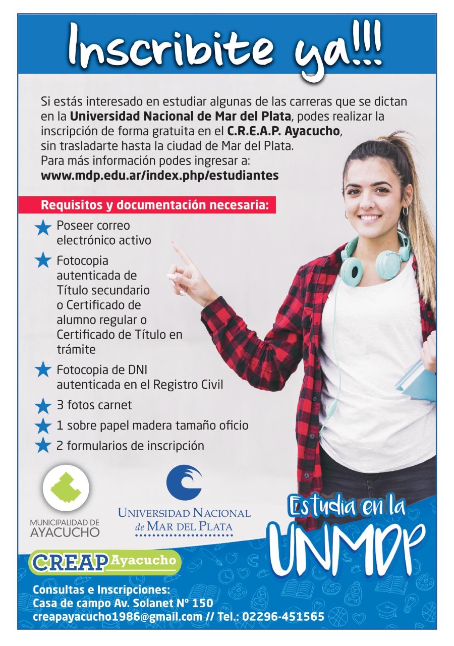 El Centro de Estudios Universitarios Terciarios y Capacitaciones comunica que continúa la inscripción a las carreras presenciales y a distancia que ofrece la Universidad Nacional de Mar del Plata. Los interesados en realizar la inscripción, pueden hacerlo sin necesidad de viajar, sólo tienen que acercarse a la oficina del CREAP ubicada en calle 9 de Julio Nº 868, de lunes a viernes de 7.30 a 13.00 horas, o realizar consultas al teléfono: 02296-451565.