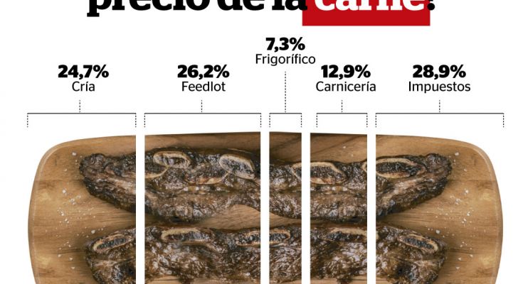 El informe de FADA demuestra que, la carne en marzo tuvo un precio promedio de $324,56 por kilogramo, de ese precio el ternero representa el 24,7% ($80,06), el feedlot el 26,6% ($85,30), el frigorífico el 7,3% ($23,62), la carnicería el 12,9% ($41,79) y los impuestos el 28,9% ($93,79).