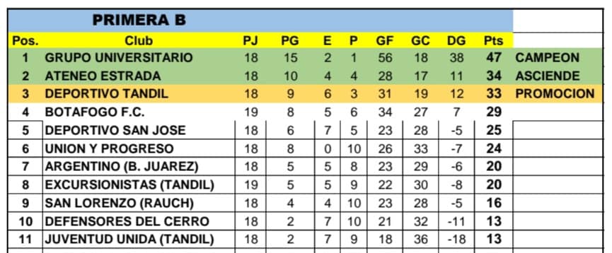 En Primera B, Grupo Universitario estrenó su título de campeón goleando a San José, mientras que Ateneo Estrada le ganó a Unión y Progreso y ahora se metió en zona de ascenso directo, relegando a SD Tandil a jugar el Repechaje. Solo restan dos fechas. Aquí el detalle de la jornada: