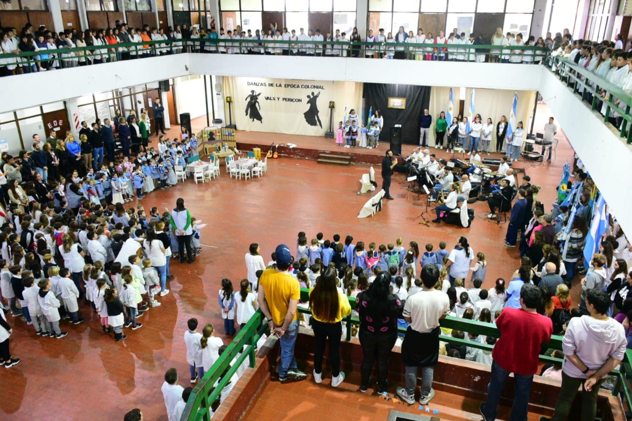 Ante la presencia y el acompañamiento de la comunidad educativa del establecimiento anfitrión, banderas de ceremonia de distintos escuelas, autoridades y público en general, el escenario protocolar contó con la interpretación del Himno Nacional Argentino a través de la Banda Municipal de Música, seguidamente a las palabras alusivas de la docente Daniela Acuña.