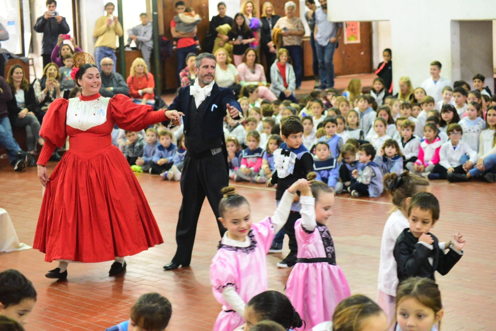 En conmemoración al 213 aniversario de la Revolución de Mayo de 1810, el acto dio paso a la recreación que alumnos y docentes presentaron sobre la semana de Mayo con mensajes, cantos, bailes y danzas típicas de la época colonial, acompañados por los bailarines Raúl Etcheverry y Cecilia Teruel.