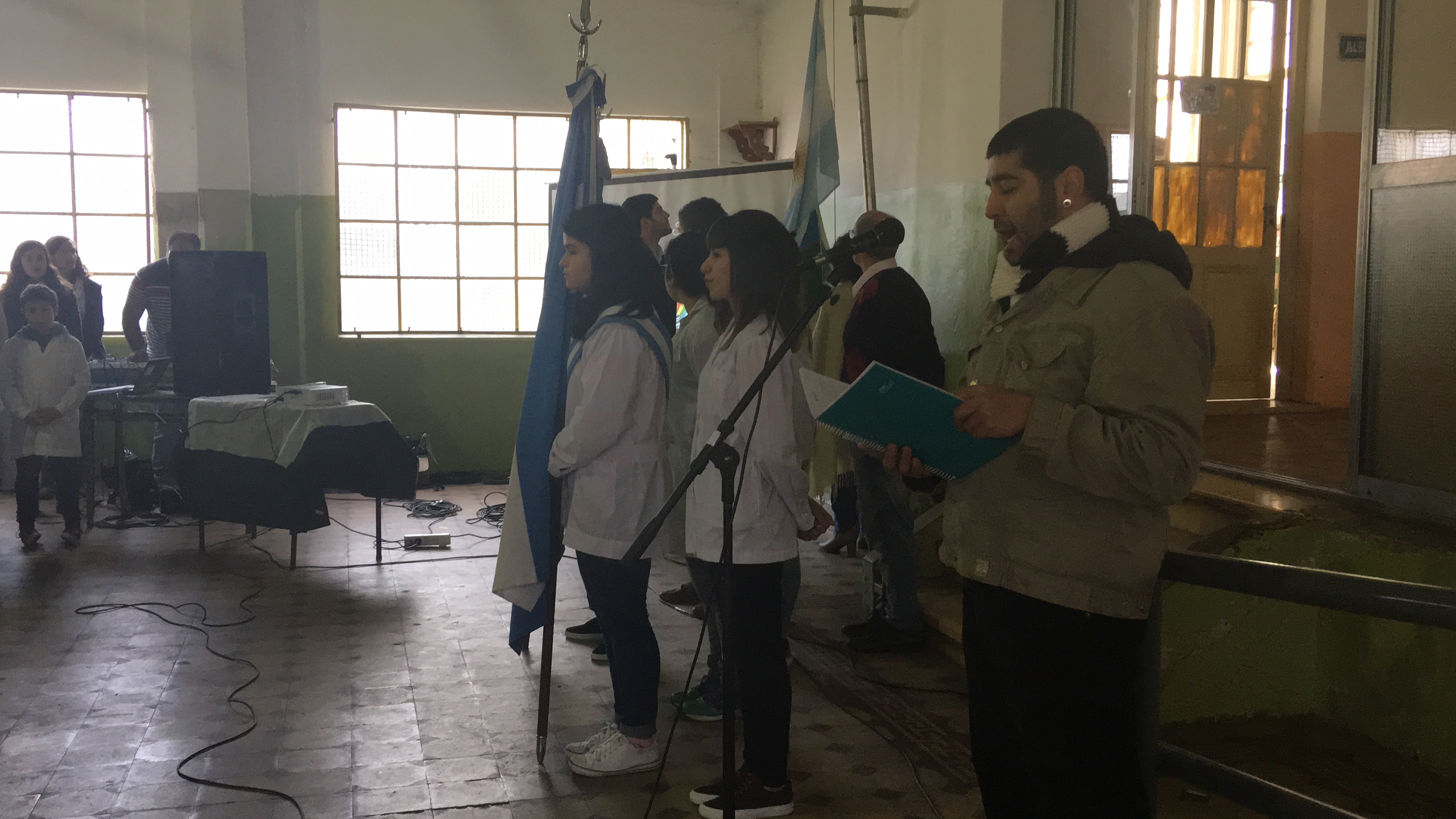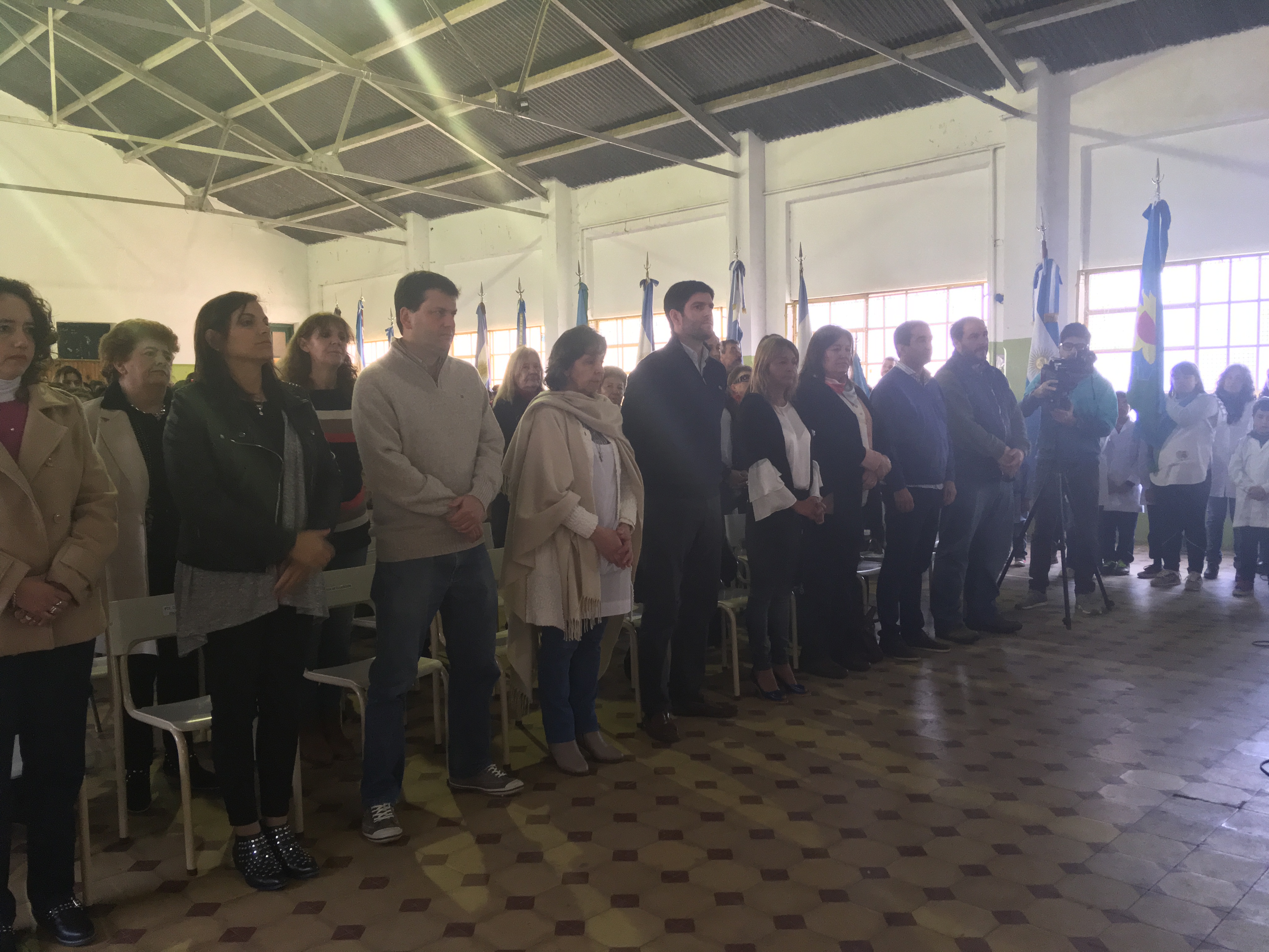 En el interior del establecimiento y luego del ingreso de las Banderas de Ceremonias que se dieron cita, se realizó el izamiento a media asta de la Bandera Nacional de la Escuela, a cargo del Intendente Emilio Cordonnier, la Directora de la EES Nº6, Prof. Norma Santilli, la Jefa de Educación Distrital, Prof. Nancy Sammaromme, mientras de manera magistral el cantante José Morales entonó Aurora.