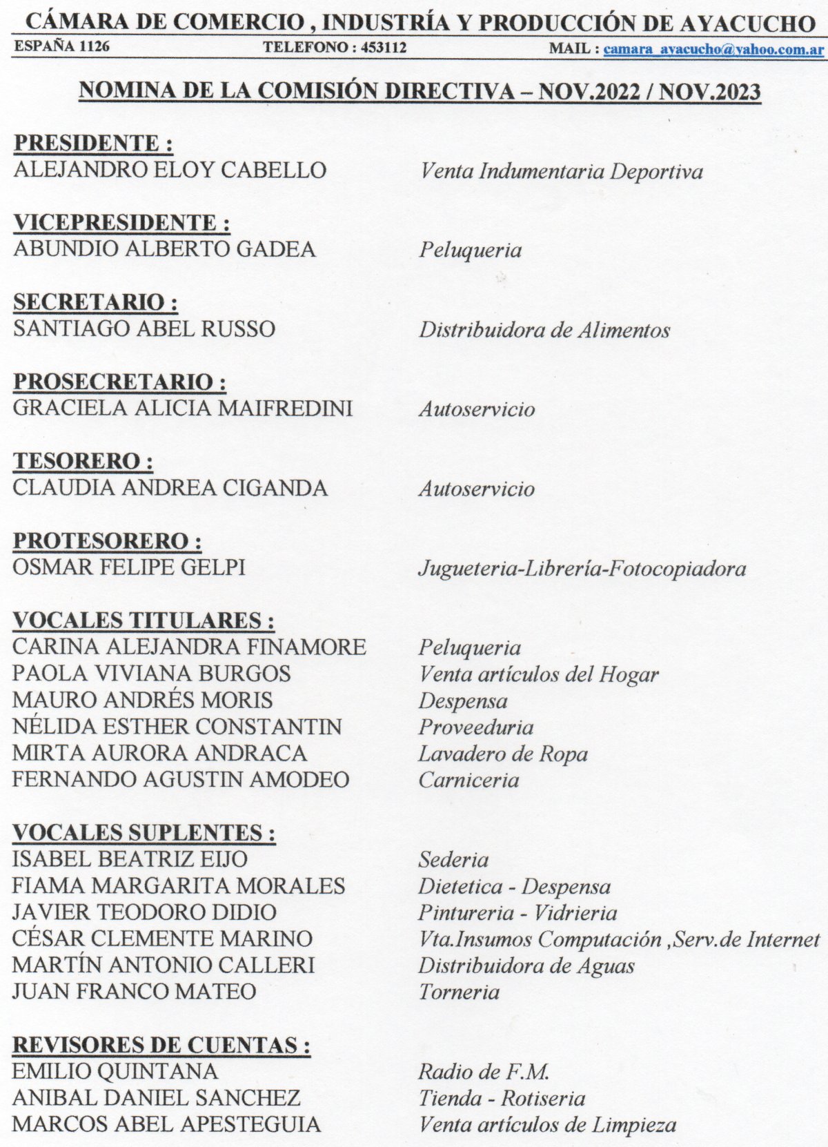 Y también se aprobó autorizar a la Comisión Directiva a vender bienes en desuso , adquirir nuevos y firmar o renovar contratos. Por último se procedió a renovar parcialmente la Comisión Directiva , la cuál quedo conformada de la siguiente manera , para el periodo Noviembre/2022 – Noviembre/2023: