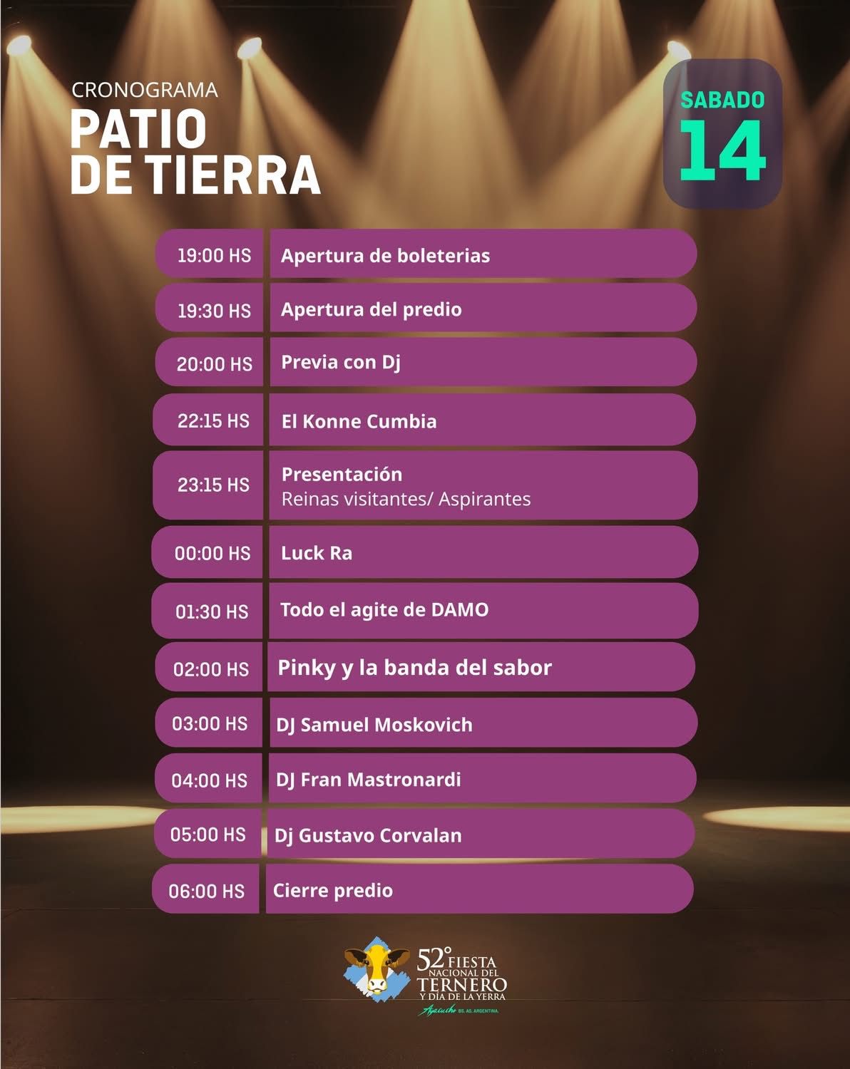 Hoy viernes arranca otro de los pilares de nuestra Fiesta del Ternero como lo es el Patio de Tierra, que como todos los años se realiza en el Estadio Municipal “Dr. José Antonio Barbieri”, que tendrá a Ángela Leiva y Eugenia Quevedo como las principales figuras. La apertura de boleterías será a las 19 horas en tanto que ya a las 19,30 se podrá ingresar al predio.