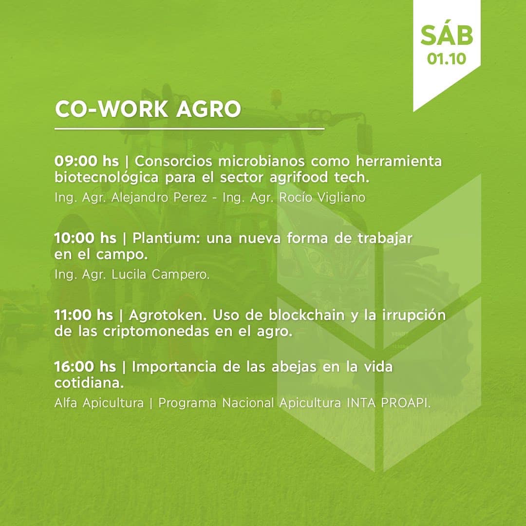 Las actividades en Cowork Agro tendrán una cantidad de propuestas muy atractivas y para todos los gustos. El viernes 30 de septiembre serán cuatro los ejes que se desarrollarán: Bioagricultura, Insumos Agrobiológicos, lanzamiento de productos y entidades financieras.