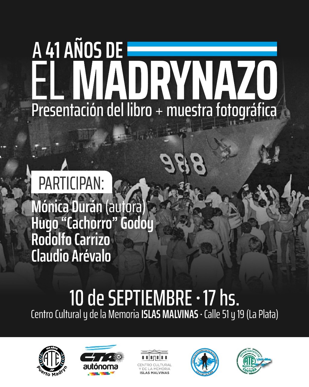 Desde ATE Seccional Ayacucho informaron que participaron ayer miércoles en La Plata, de la presentación del libro “El madrynazo”, a 41 años de aquella movilización en donde los habitantes de Puerto Madryn, se opusieron al desembarco de una flota de guerra que buscaba atracar en el puerto de esa ciudad, con el recuerdo muy fresco y presente de lo que hacía ocurrido en la Guerra de Malvinas.