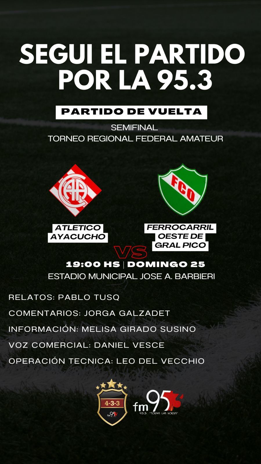 Este domingo desde las 19, con transmisión de La 95.3 y su equipo 4-3-3, Atlético Ayacucho recibirá a Ferro de Pico – La Pampa – en el partido de vuelta de las semifinales del Regional Amateur 2026.
