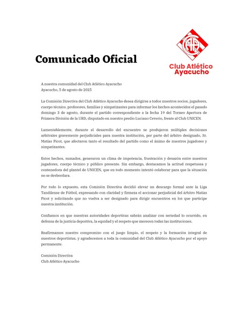 Luego de lo que fue el episodio que posiblemente marque el desarrollo de esta URD el pasado domingo, donde 8 jugadores de Atlético fueron expulsados por el Árbitro Picot en el partido con UNICEN, la entidad albirroja emitió un comunicado en donde realiza un descargo sobre lo sucedido, como también solicita no volver a ser arbitrado por Picot.