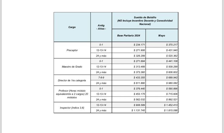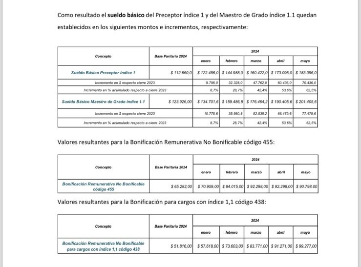 En dicha negociación colectiva con el objetivo de sostener el Poder Adquisitivo de las y los docentes en este difícil contexto macroeconómico de caída de recursos descripto e informado a las representaciones gremiales el día 7 de mayo. En tal sentido, el Poder Ejecutivo trae a consideración de los sindicatos una propuesta salarial con vigencia desde el 1° de mayo, que implica un incremento promedio adicional al otorgado en el mes de abril de 7,5 puntos porcentuales. De esta manera los salarios docentes que se abonan con fondos provinciales se habrán incrementado en promedio en 8,7% a partir de enero, 28,7% a partir de febrero, 42,2% a partir de marzo, 51,7% a partir de abril y 59,2% a partir de mayo respecto del cierre de la paritaria 2023.