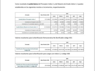 - b) Traspaso de $5.000 de bonificación remunerativa no bonificable (liquidada bajo código 455 y prevista en la Resolución N° 73/2021 del Ministerio de Trabajo y modificatorias) al sueldo básico del preceptor índice 1.