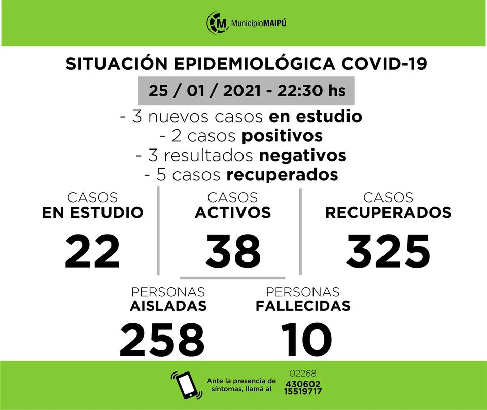 Hay 2 nuevos casos activos de COVID 19, 3 nuevos casos en estudio, se recibieron 3 resultados negativos y 5 maipuenses más recuperados. Hoy los activos son 38. El estado epidemiológico de Maipú indica que […]