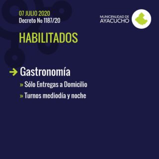 Gastronomía: Solo entrega a domicilios, mediodía y noche, por delivery.