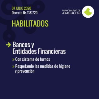Bancos y entidades financieras: Con sistema de turnos, respetando las medidas de higiene y prevención.