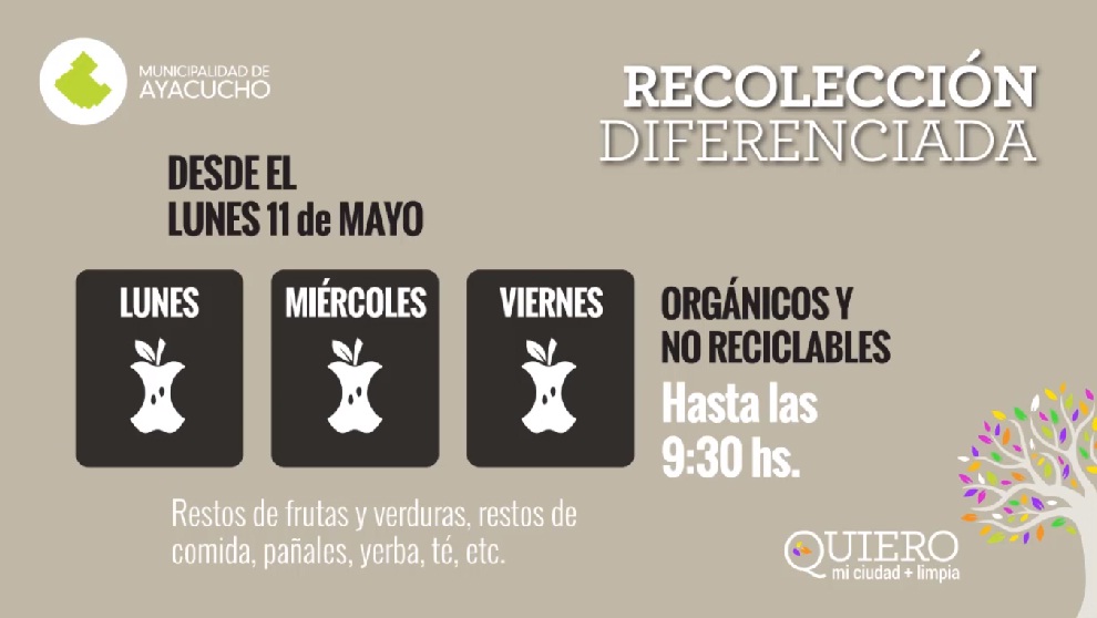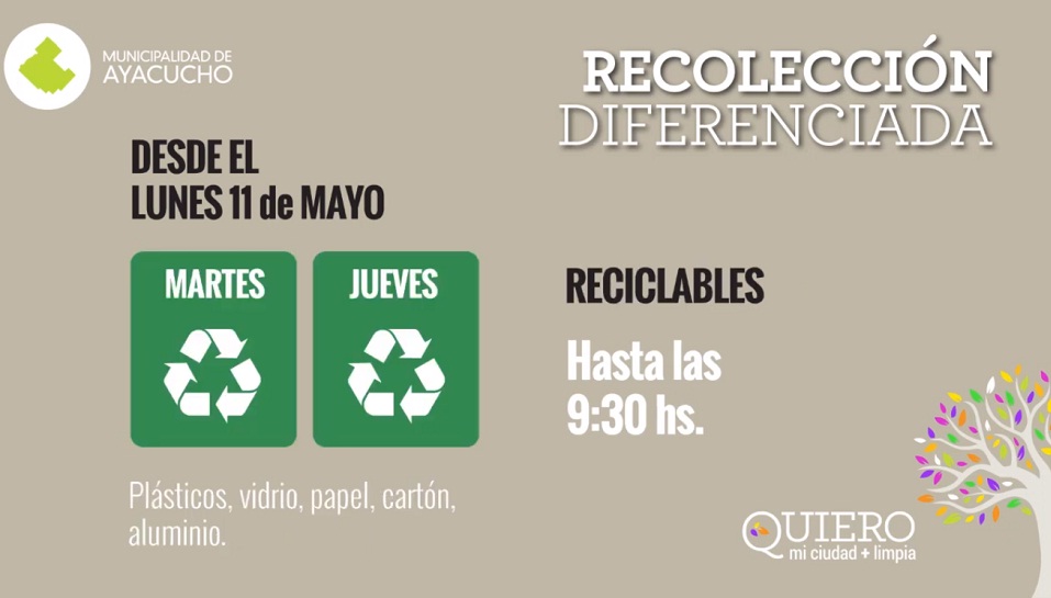 La Municipalidad de Ayacucho presentó el nuevo sistema de Recolección Diferenciada de Residuos, el cual se encuadra dentro programa “Quiero mi ciudad más limpia”. El Intendente Municipal Lic. Emilio Cordonnier y el Subsecretario de Servicios Urbanos, Valentín Fascia, fueron los encargados de comunicar esta nueva herramienta a implementarse a parte de este lunes 11 de mayo.