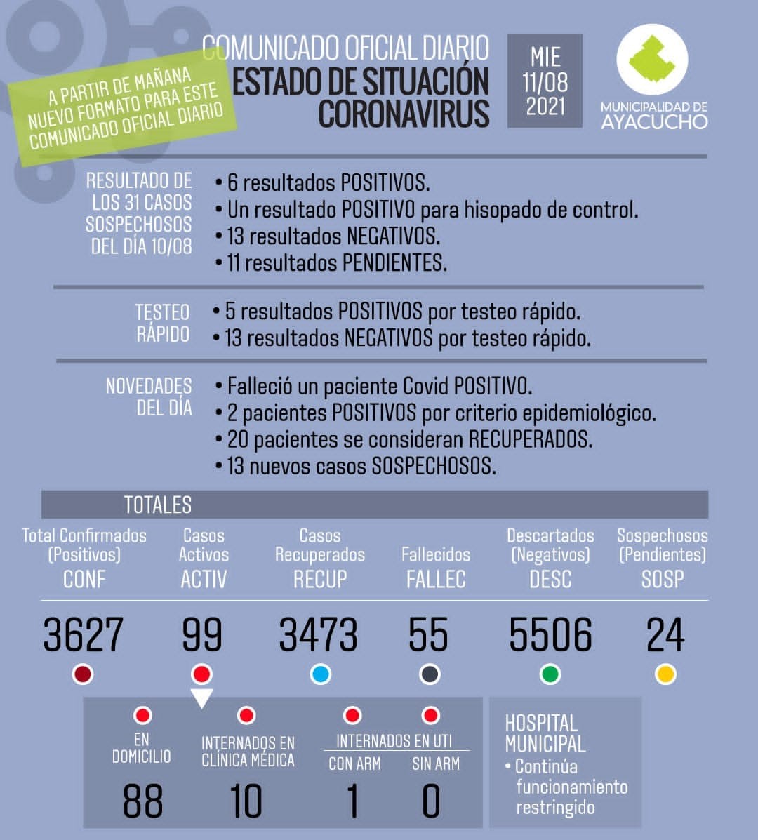 Lamentablemente, en las últimas 24 horas se produjo un nuevo deceso como consecuencia del Covid. Se trató de una mujer que se encontraba internada en el Hospital Municipal. Con su fallecimiento, ya son 55 las víctimas desde el inicio de la pandemia.