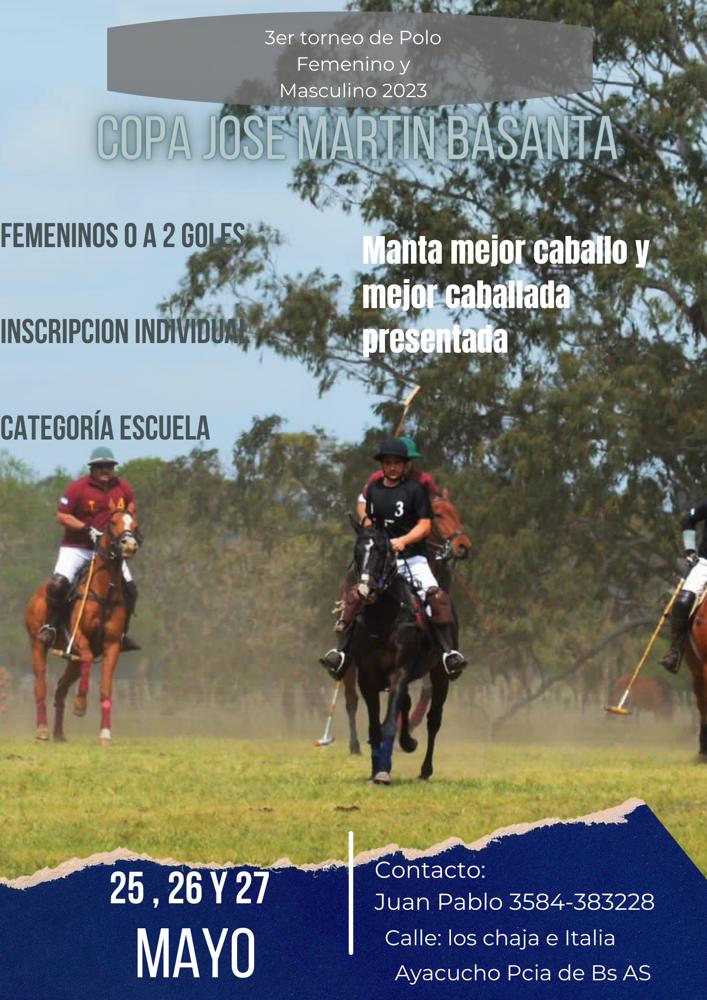 Ayacucho será sede de la 3ª edición del torneo de Polo Femenino y Masculino 2023, que se disputará desde el 25 al 27 de Mayo, donde se pondrá en juego la “Copa José María Basanta”. Habrá distintas alternativas de juego. Para los interesados en recabar más información, comunicarse con Juan Pablo al 3584 – 383228.