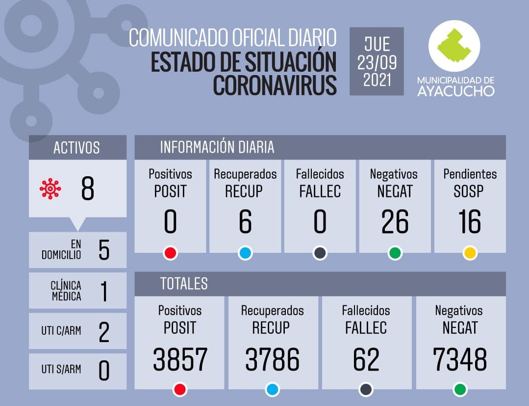 Ayacucho, después de mucho tiempo, logró descender a un dígito en pacientes activos con Covid. En las últimas 24 horas no se produjeron contagios y como sí hubo 6 recuperados, los activos actuales son solo 8. De ese total, 5 se encuentran en sus domicilios y el resto en el Hospital Municipal (1 en Clínica Médica y 2 en Unidad de Cuidados Intensivos).