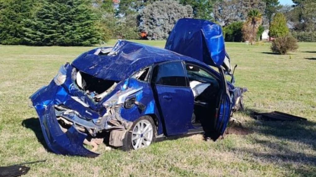 El Ford Focus terminó destrozado en el interior del predio del Cementerio Privado Parque de la Sierra.