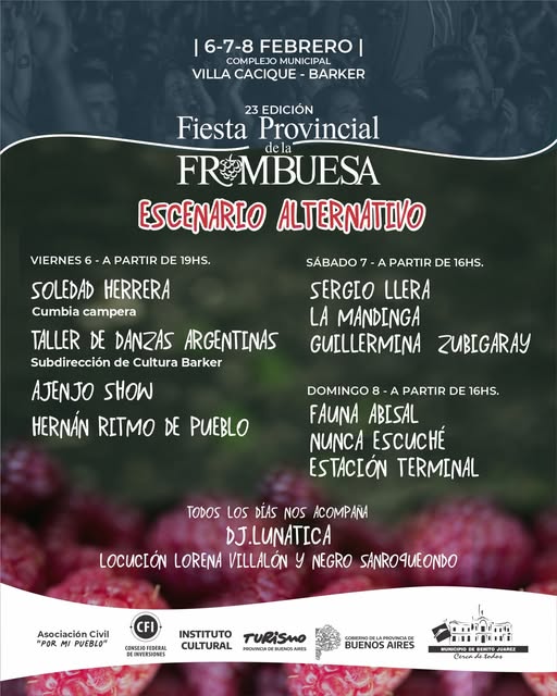 Barker; 6, 7 y 8 de Febrero – Escenario alternativo en la Fiesta Provincial de la Frambuesa 22 enero, 2026 Pablo Tusq destacados, Zonales y Regionales 0 El escenario alternativo también vibra en la Fiesta Provincial de la Frambuesa Artistas que traen identidad, talento y mucha energía para disfrutar tres días a puro encuentro. 6, 7 y 8 de Febrero Mirá quiénes se suben al escenario y vení a descubrir nuevas voces! X