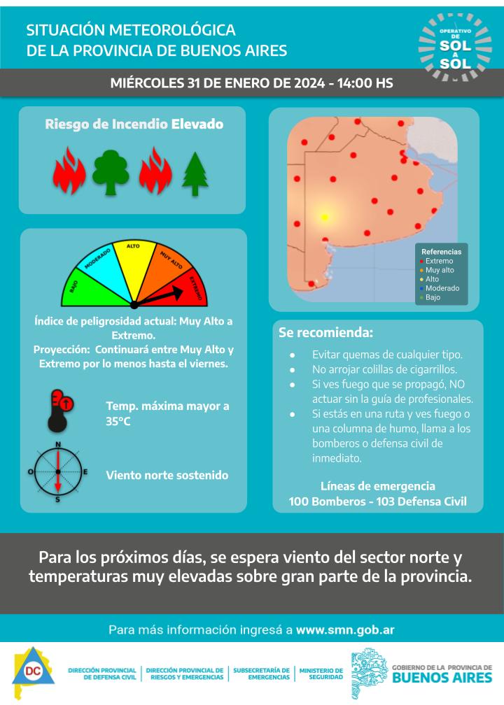Desde Bomberos Voluntarios enviaron a los medios un flyer comunicando el riesgo extremo de incendio forestales, teniendo en cuenta la altísima temperatura como el viento del sector norte, dos factores que aumentan al máximo las posibilidades de que se desarrolle un incendio de pastizales como de monte. Y como esta situación se prolongará por varios días, es que desde Bomberos se busca reducir lo más posible toda chance de incendio.