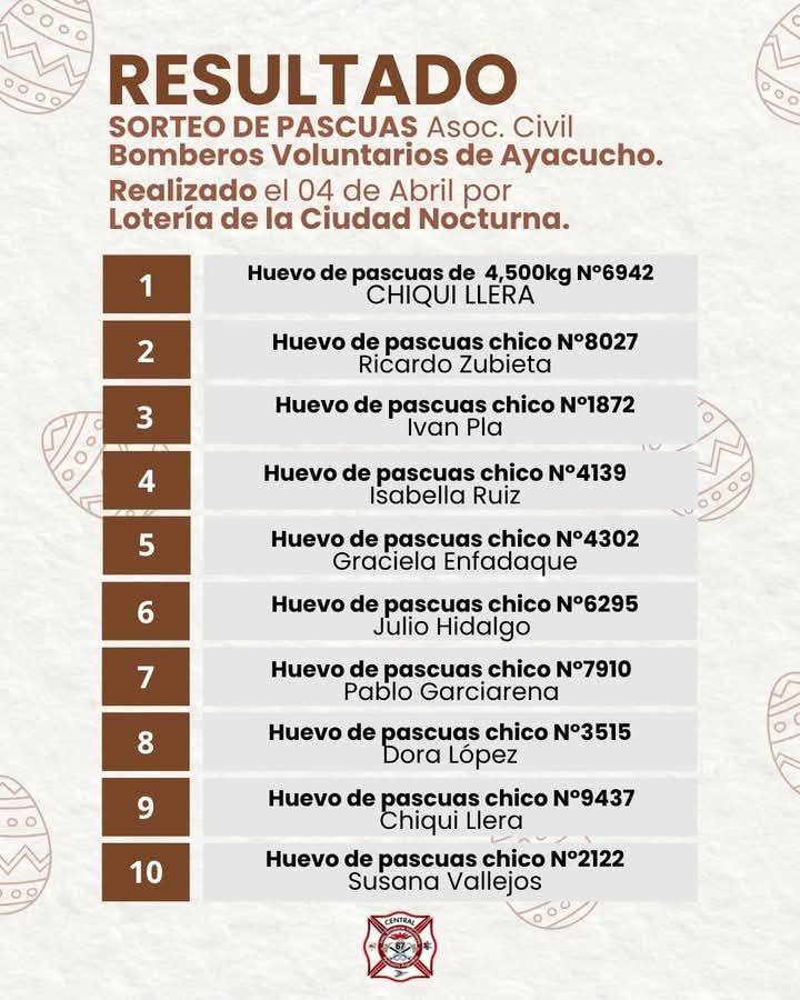 Les compartimos el resultado del SORTEO DE PASCUAS Asociación Civil Bomberos Voluntarios de Ayacucho.