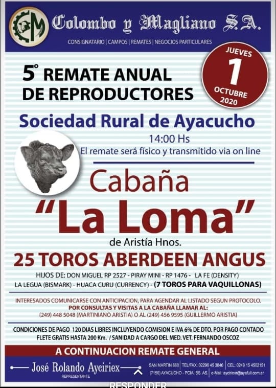 Cabaña «La Loma» de Aristía Hnos realiza su 5to Remate Anual el jueves 1ero de Octubre en la Sociedad Rural de Ayacucho. Debido a la pandemia por el covid19, será sin público, sin almuerzo, iniciándose a las 14, solo para invitados y con transmisión on line.