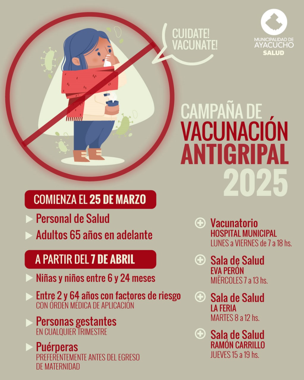 La Subsecretaría de Salud de la Municipalidad confirmó que como parte de la 𝐂𝐚𝐦𝐩𝐚𝐧̃𝐚 𝐝𝐞 𝐕𝐚𝐜𝐮𝐧𝐚𝐜𝐢𝐨́𝐧 𝐀𝐧𝐭𝐢𝐠𝐫𝐢𝐩𝐚𝐥 𝟐𝟎𝟐𝟓, a partir de este lunes 7 de abril, se amplió la convocatoria a todos los grupos de riesgo.