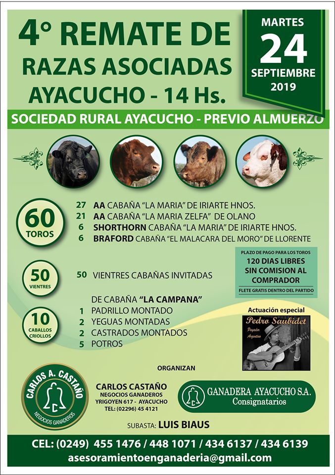 La firma “Carlos Castaño Negocios Ganaderos” concretará en la Sociedad Rural de Ayacucho este martes 24 de septiembre desde las 14, previo almuerzo, el 4to Remate Anual de Razas Asociadas. Entrevistamos a Carlos Castaño, organizador de este evento que crece año a año, y que hemos compartiendo siempre con www.ayacuchoaldia.com.ar y La 95 FM cada detalle antes, durante y después de su realización.