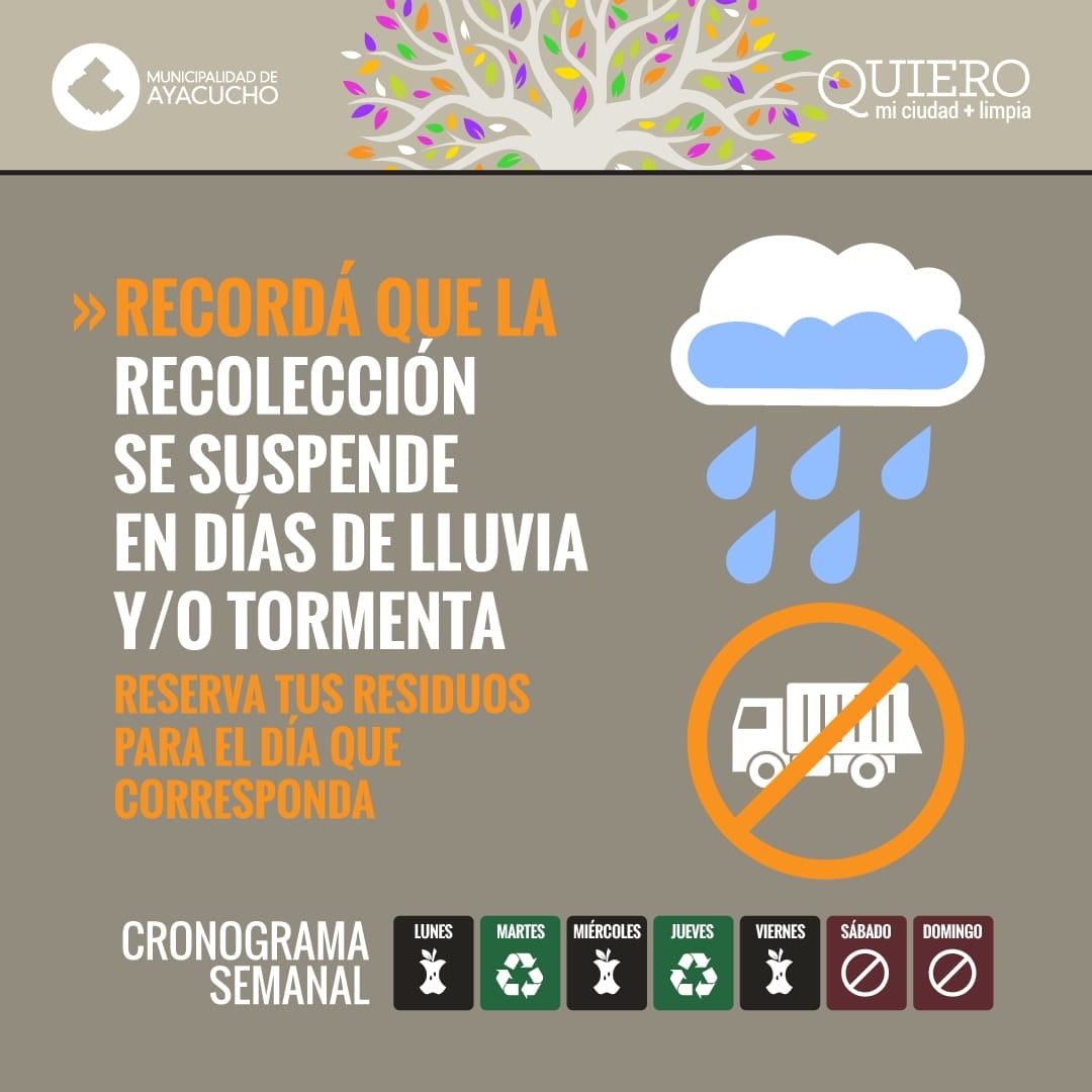 La Municipalidad de Ayacucho informa que queda SUSPENDIDA la recolección de residuos del día de la fecha debido a las condiciones climáticas adversas. Se pide especial colaboración a los vecinos y comercios de nuestra ciudad, en reservar […]