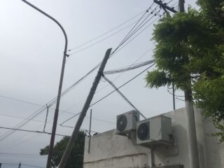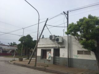 Como consecuencia del fuerte viento de este sábado por la tarde, el tendido eléctrico en nuestra ciudad sufre la sobrecarga de líneas, y que sumado a que muchos de los postes son de madera y llevan años en su lugar, se pudren y no resisten los embates de las ráfagas. El caso puntual es el del poste situado en Belgrano y Miguens, que se quebró en su base aflojando la tensión del tendido de cables, y quedando apoyado sobre otra de las líneas, lo que representa un riesgo de importancia.