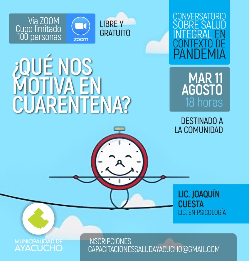 Este ciclo de charlas está dirigido al público en general con la idea de generar un nuevo espacio y ofrecer herramientas emocionales para atravesar la situación de la Pandemia. Participarán de la disertación, distintos profesionales de la salud. Sumate. Será vía ZOOM, y la inscripción podés realizarla en el siguiente mail: capacitacionessaludayacucho@gmail.com