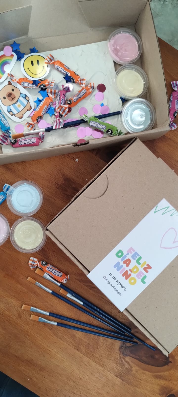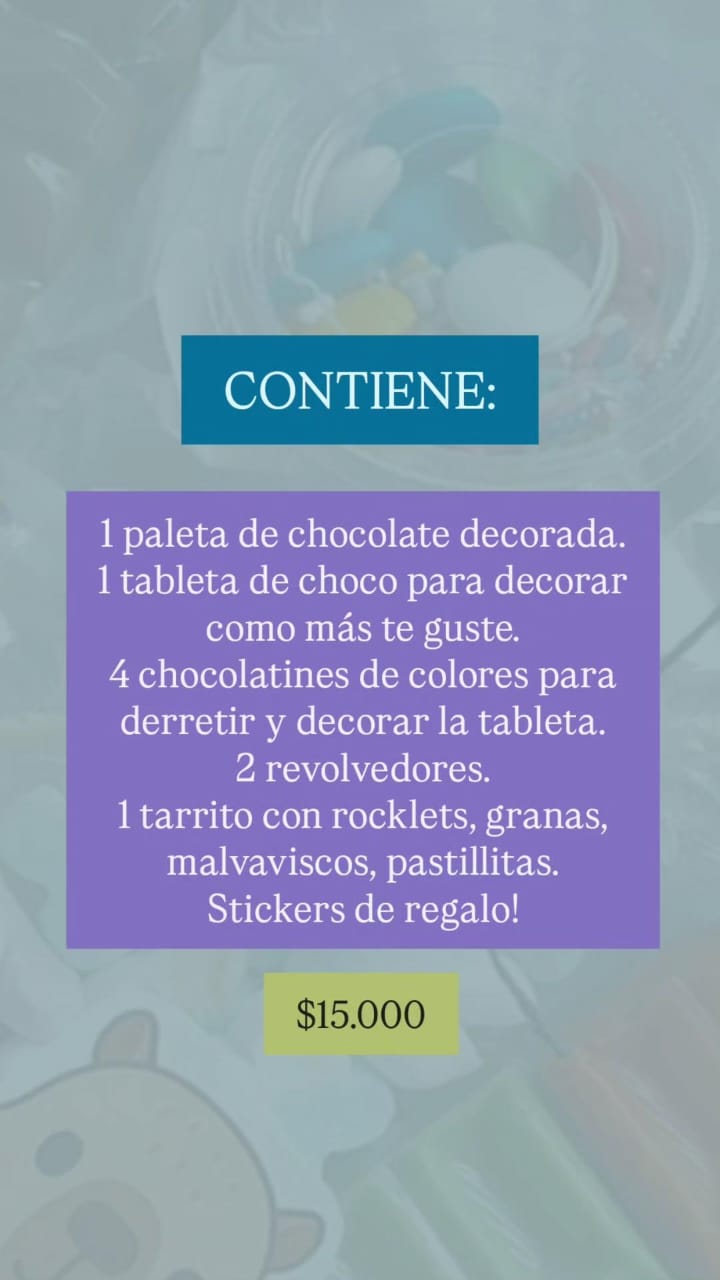 Incluye; cuadro de fibrofacil con pasta relieve de 15 x 20 cm, 3 potes de pintura, un pincel, stickers y caramelos…Materiales para crear una obra única, cupos limitados…$ 15.000.- pedidos al 2494-214590.