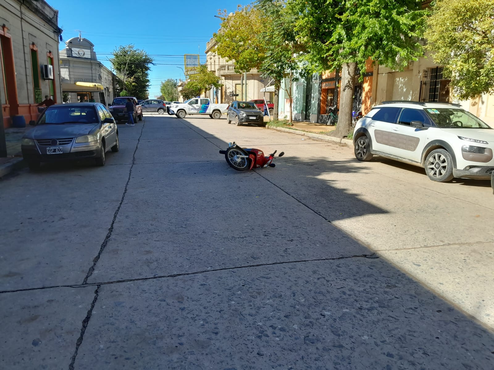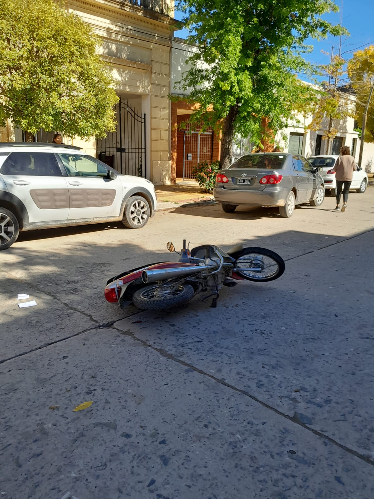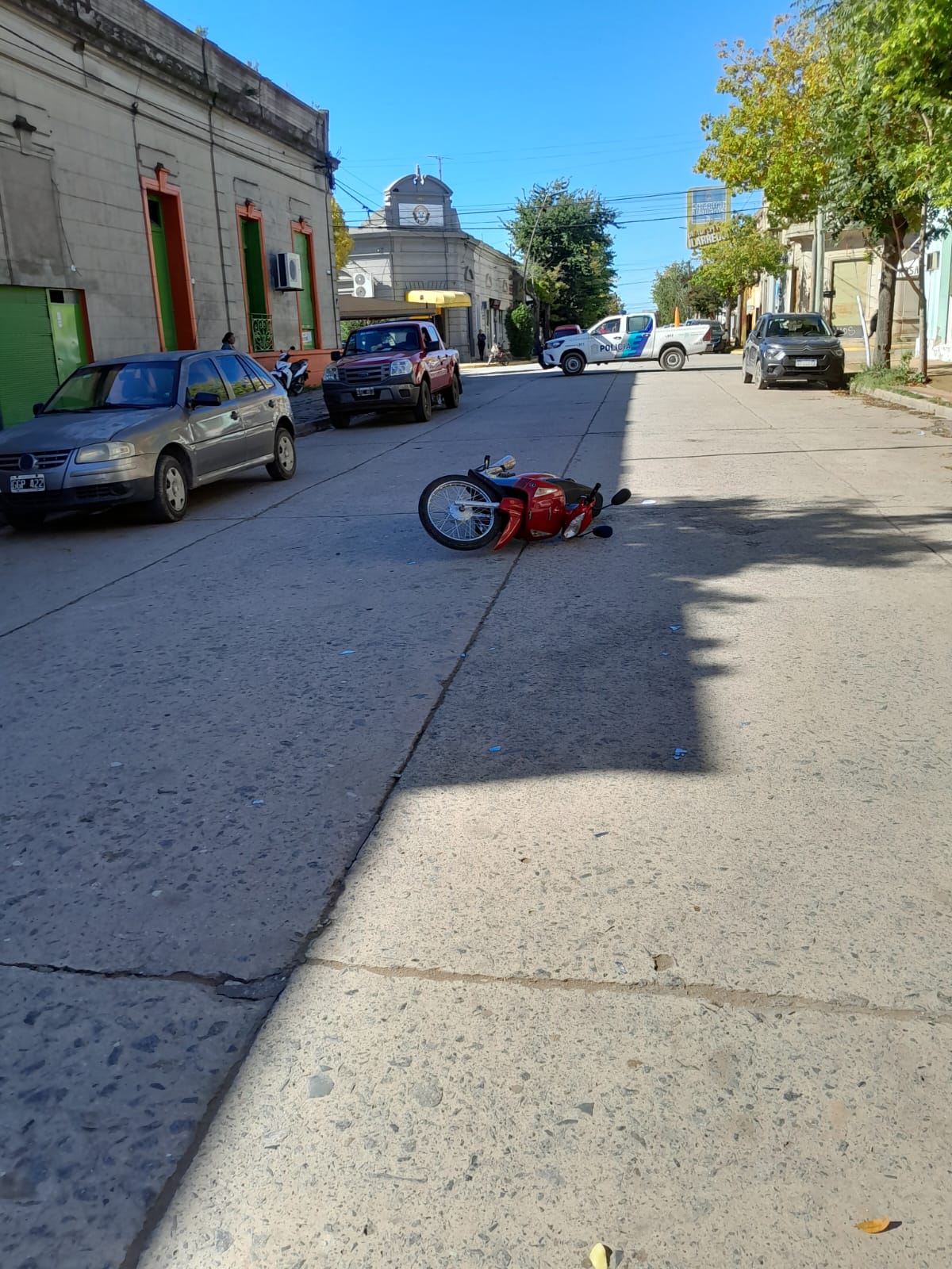 Esta mañana se registró un nuevo accidente de tránsito en la intersección de Irigoyen y San Martín, entre una motocicleta y un automóvil.