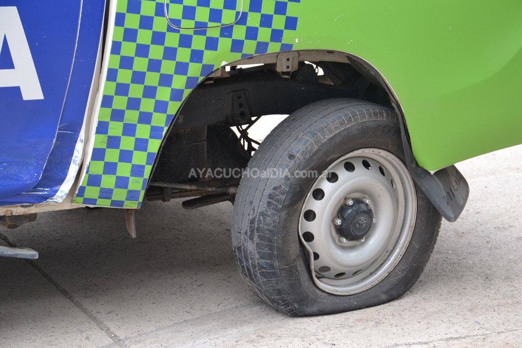 Como lo muestran las imágenes tomadas por Ayacuchoaldia.com.ar, fue la camioneta Toyota Hilux de la Estación de Policía local la que llevó la peor parte donde el golpe se da en el eje trasero, generando un corrimiento del mismo.