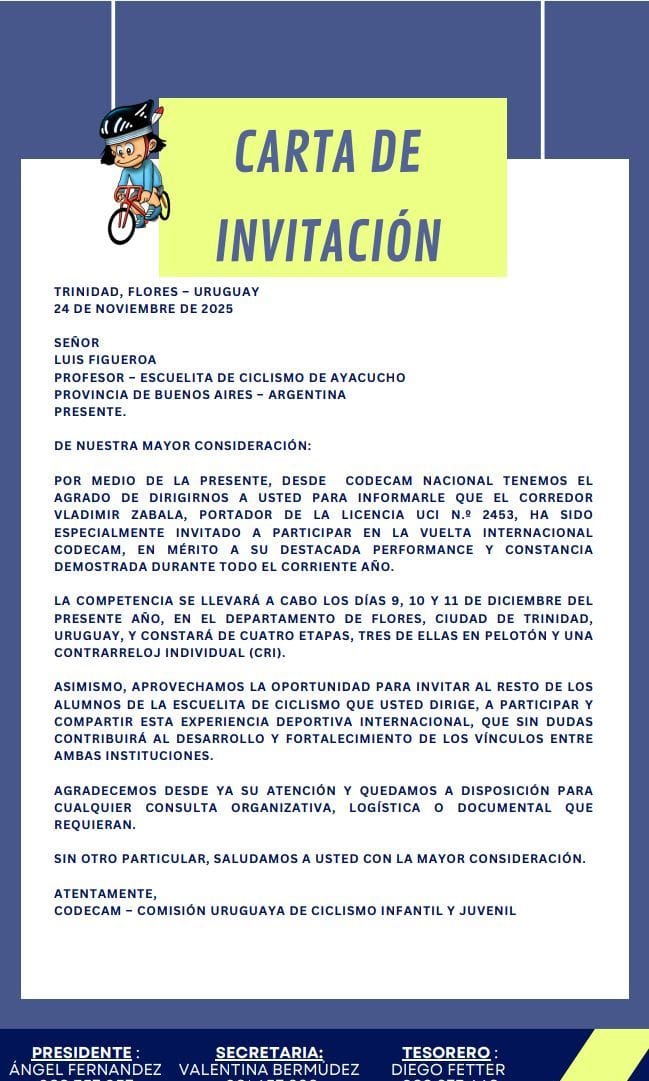 Ciclismo- Vladimir Zavala fue invitado a correr en Uruguay y se solicita apoyo económico 5 diciembre, 2025 Pablo Tusq Deportes, deportes DIA, destacados 0 Luis Figueroa coordinador de la Escuelita de Ciclismo, solicita por este medio la ayuda a toda la comunidad; X