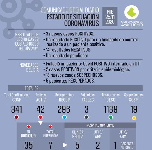 Cinco nuevos positivos de Covid se registraron este miércoles 25 de Noviembre, de los cuales dos de ellos se dan a través del criterio epidemiológico. A su vez, también fue positivo por hisopado de control un paciente que ya había sido diagnosticado con la enfermedad. De los 19 casos sospechosos de la jornada anterior, 14 fueron negativos y uno de ellos quedó pendiente.
