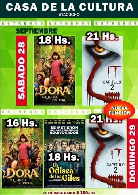 Para cerrar el mes de septiembre con nuevas propuestas culturales, este fin de semana en la Sala “Hugo del Carril” de la Casa de la Cultura se anuncian en cartelera de cine la proyección de cuatro películas de estreno. La cartelera es la siguiente: