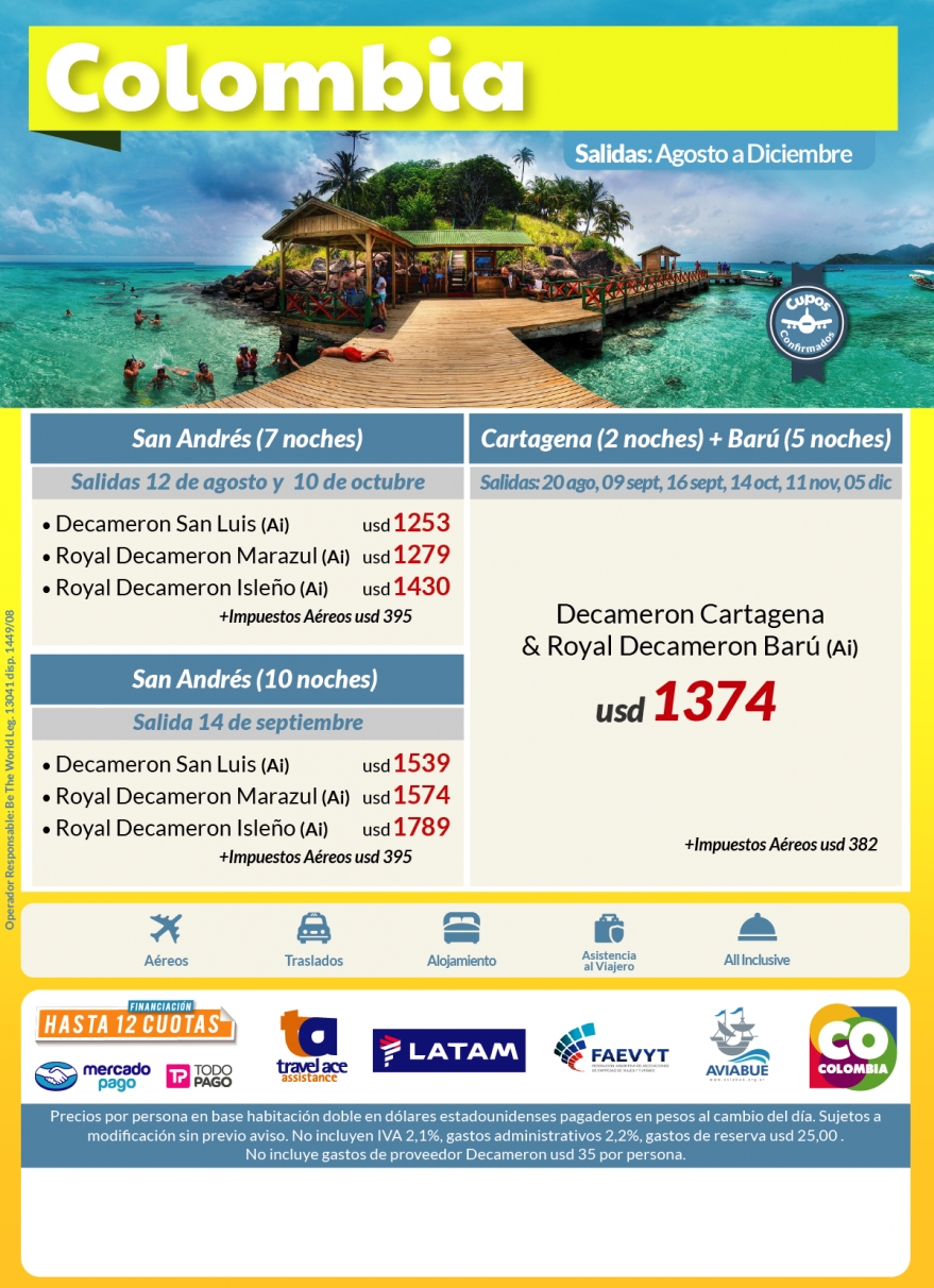 Marita Aranda Viajes, representante en Ayacucho de WAVE Viajes, sigue con notables propuestas para que tus vacaciones sean siempre soñadas. Ahora, el destino que te ofrece es Colombia, la bella Colombia, la costa norte bañada por el Mar Caribe, con aguas transparentes, un clima siempre a pleno sol y playas insuperables. Consultá a Marita Aranda Viajes, en Murgier 1084.