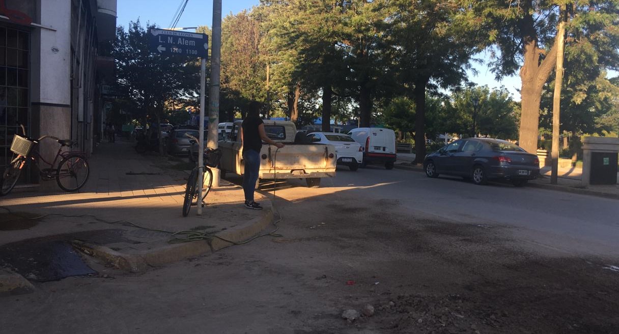 Una imagen que no dice nada pero lo menciona todo. Tarde de Miércoles, de calor, pleno centro, frente al Municipio y a la Plaza en la esquina de Alem y San Martín, y la empleada de una casa histórica de indumentaria riega la calle por la tierra que se levanta con el paso de los autos.