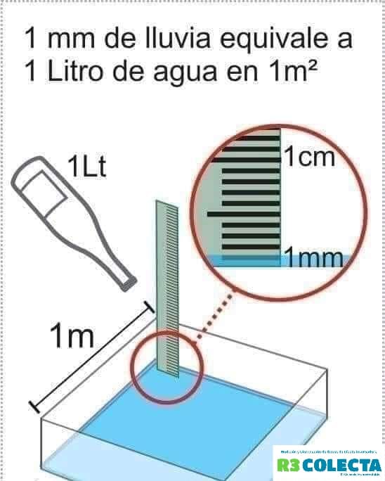 De tal manera que una precipitación de 20 litros es equivalente a decir 20 mm o 2 cm de agua.