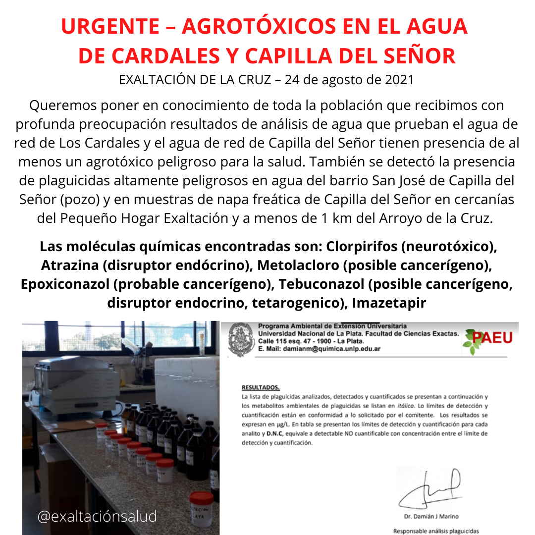 Queremos poner en conocimiento de toda la población de Exaltación de la Cruz que recibimos con profunda preocupación resultados de análisis de agua que prueban el agua de red de Los Cardales y el agua de red de Capilla del Señor tienen presencia de al menos un agrotóxico peligroso para la salud. También se detectó la presencia de plaguicidas altamente peligrosos en agua del barrio San José de Capilla del Señor (pozo) y en muestras de napa freática de Capilla del Señor en cercanías del Pequeño Hogar Exaltación y a menos de 1 km del Arroyo de la Cruz.