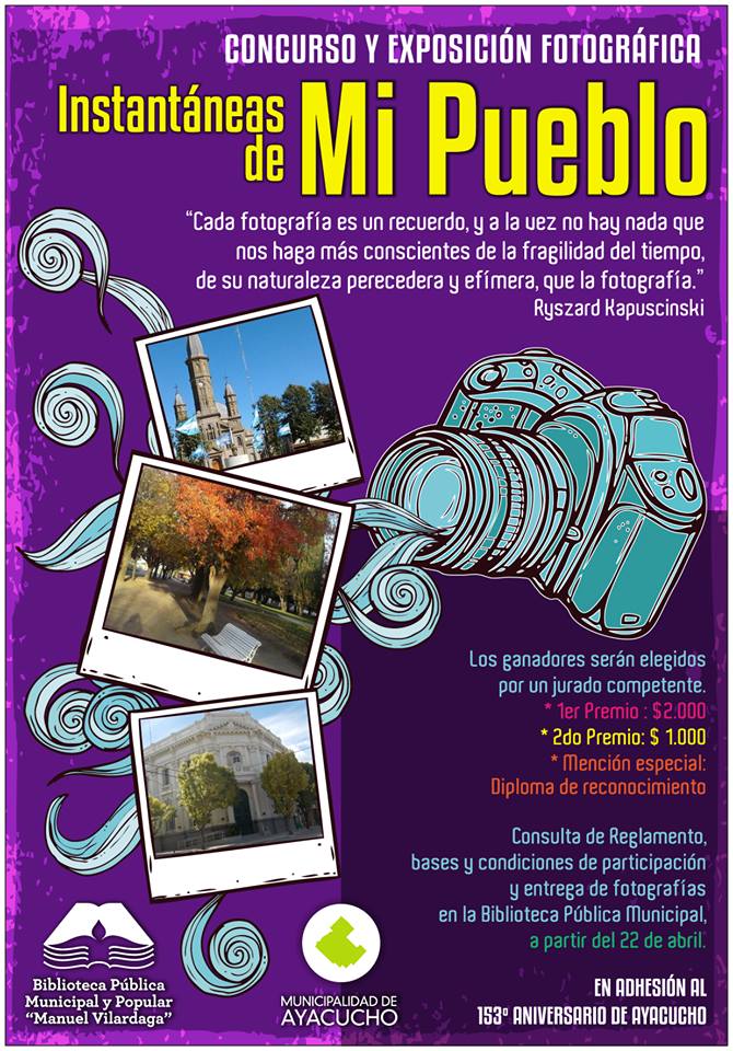 La Biblioteca Pública, Municipal y Popular Manuel Vilardaga propone este año una nueva actividad: el Concurso para crear la exposición fotográfica “INSTANTÁNEAS DE MI PUEBLO”, en adhesión al Aniversario de Ayacucho.