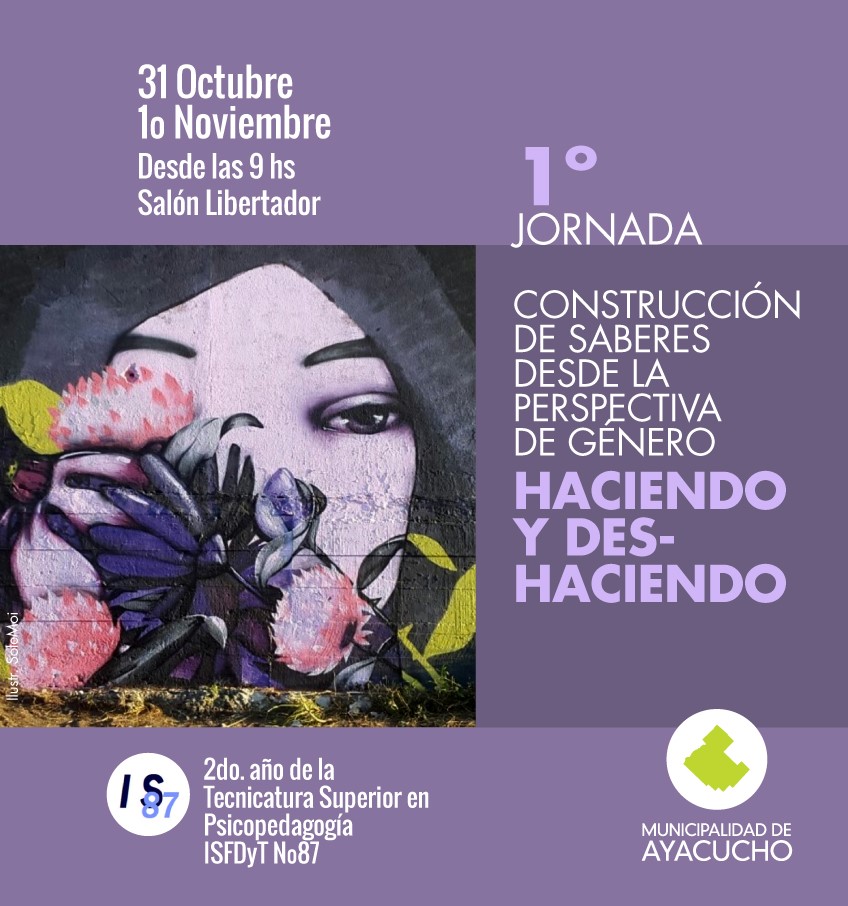 La Municipalidad de Ayacucho por intermedio de la Secretaría de Salud y alumnos del 2do año correspondiente a la Tecnicatura Superior en Psicopedagogía del ISFDyT N87 (Instituto Superior de Formación Docente y Técnica), llevarán adelante la 1ª Jornada “Construcción de saberes desde la perspectiva de Género” denominada “Haciendo y Des-haciendo”. La misma se doblegará jueves 31 de octubre y viernes 1º de noviembre.