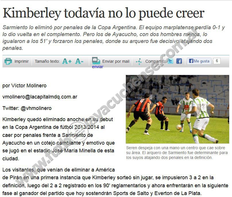 En un hecho histórico para nuestro fútbol, Sarmiento elimina a Kimberley de Mar del Plata en el Estadio Mundialista de Mar del Plata de la Copa Argentina 2013.